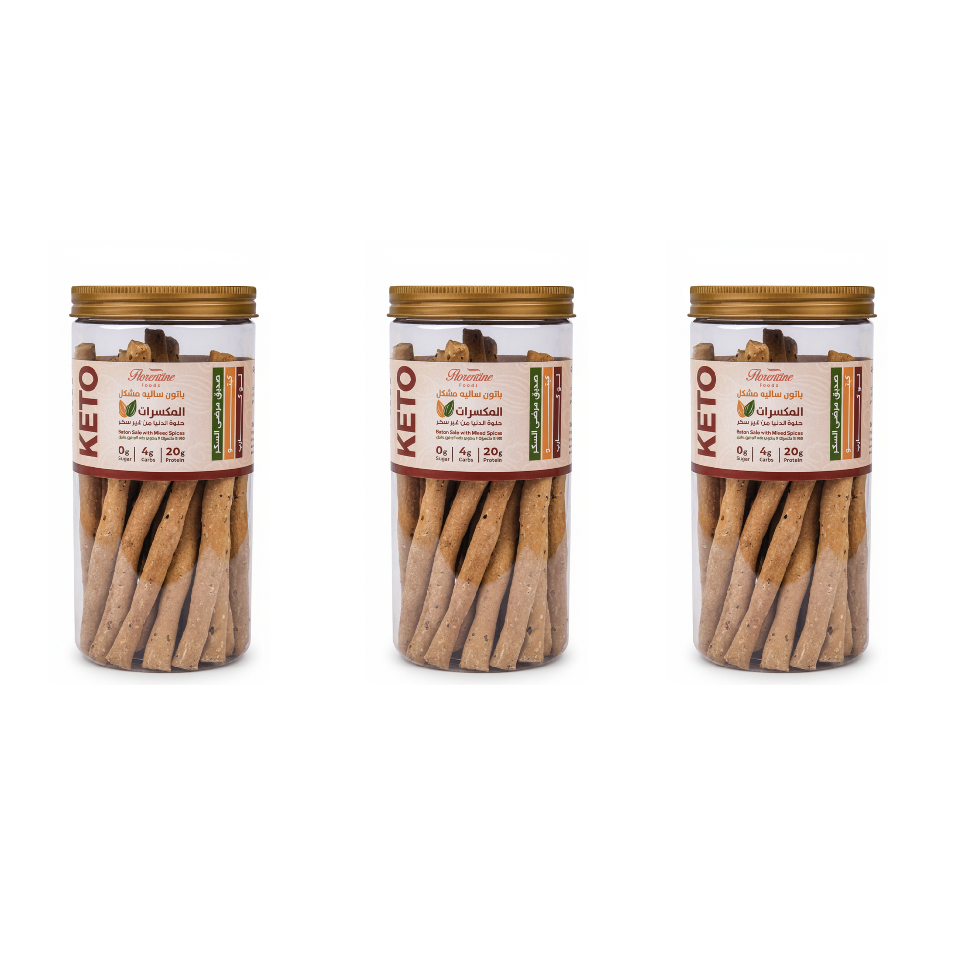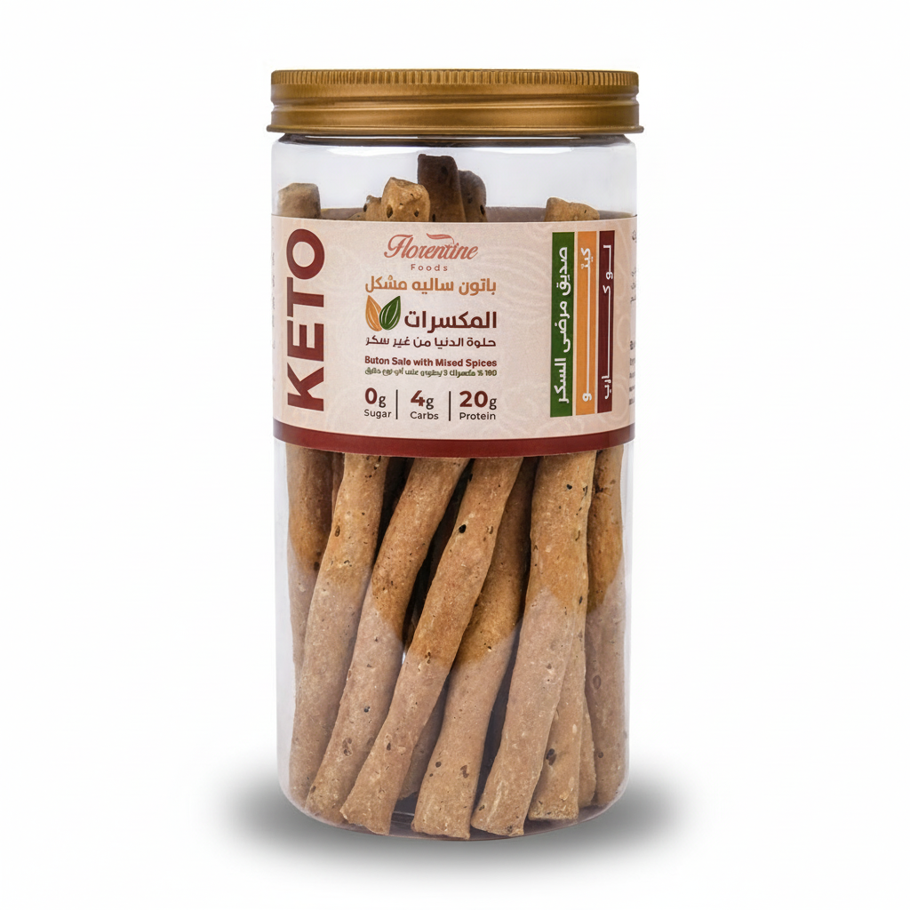باتون ساليه فلورنتين مصنوع من توليفة المكسرات الخاصة (لوز، سوداني، عين جمل، وجوز هند)، مع زيت زيتون نقي، بيكنج باودر، ولمسة من الملح واليانسون والكمون والسمسم وحبة البركة، علشان يدّيك الطعم الشرقي الأصيل والمقرمش اللي بيكمّل يومك من غير كربوهيدرات تقيلة